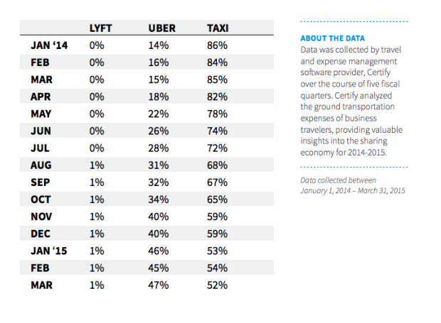 Según Certify, en el primer trimestre del 2015 un aproximado del 46% de total de viajes pagados realizados en vehículos fueron a través de Uber, comparándose con el 15% del primer trimestre del 2014. En sólo un año, la demanda de taxis regulares bajó de un 85% en 2014 a un 53% en el primer trimestre del 2015.