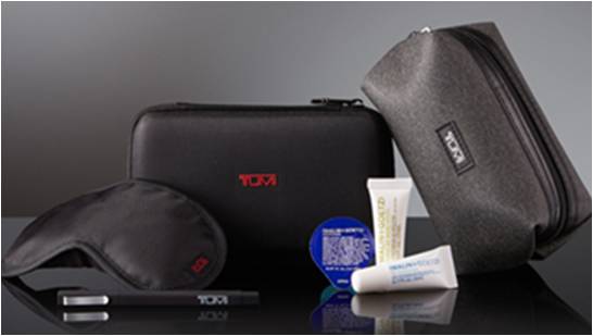 El Tumi kit incluye un lapicero soft-touch, anteojeras, Malin y Goetz humecedor de labios, loción corporal, enjuague bucal, medias, toallas faciales, tapones auditivos y un kit dental con pasta de dientes Crest. dental kit with Crest toothpaste.