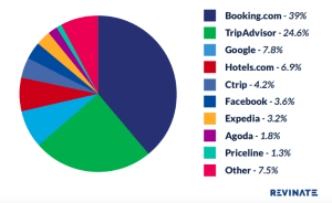 De acuerdo con la data, el principal jugador en las reseñas de hoteles online es Booking.com, acumulando el 39 por ciento de todas las reseñas a nivel mundial. TripAdvisor permanece segundo, perdiendo un poco de terreno en el último año a un poco menos de 25 por ciento de las reseñas a nivel mundial.
