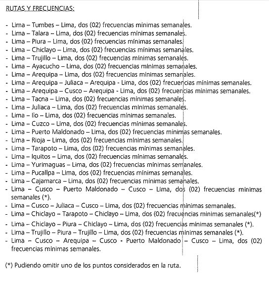 Estas son las rutas solicitadas por Latin American Airlines, cada una con 02 frecuencias mínimas semanales: