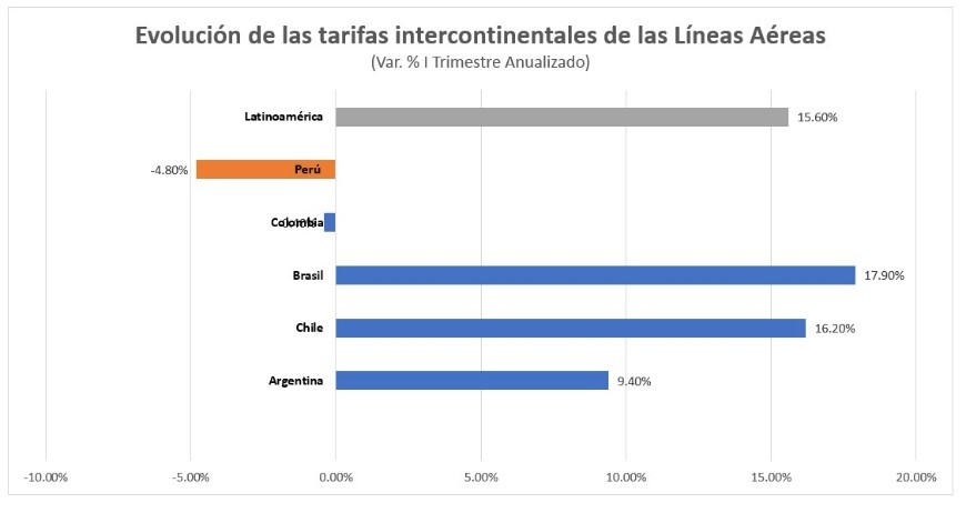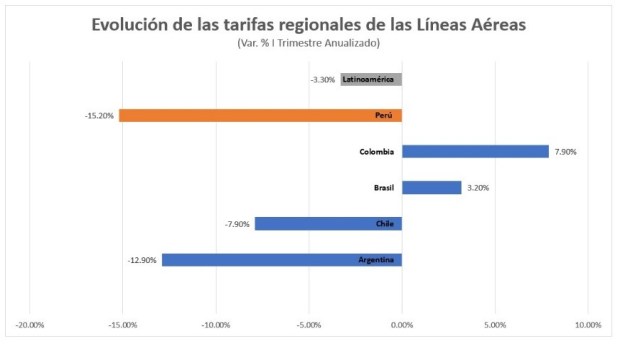 En el caso de los vuelos domésticos (Economy), Perú es el único que se mantiene en negativo. Es decir, los precios por aquí siguen bajando.