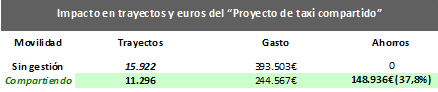 En la tabla inferior muestra el impacto del “Proyecto de taxi compartido” comparando el escenario “Sin gestión” con los datos de la casuística “compartida” de 15.922 empleados transportados en 2017 en los 11.296 trayectos realizados.