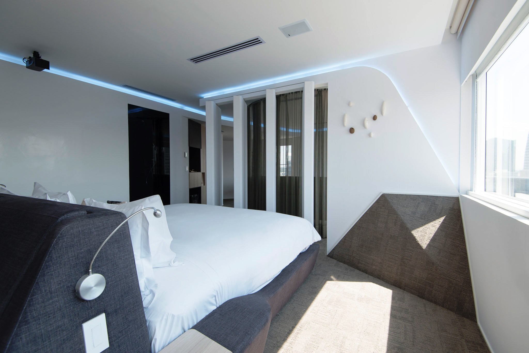 El diseño de la cama y del sofá, una experiencia tecnológica y de puro confort, fueron desarrollados por AccorHotels y la AQCEZ ejecutó el proyecto técnico que permite posicionar este mueble de acuerdo con el deseo del huésped con un comando electrónico. La paleta de colores neutros es intencional para permitir que las diversas opciones cromáticas del sistema de iluminación tengan el mejor resultado. Los tonos pueden variar entre el «calmo» y el modo «fiesta», por ejemplo. Los aparatos electrónicos se pueden controlar al alcance de las manos a través de un iPad.