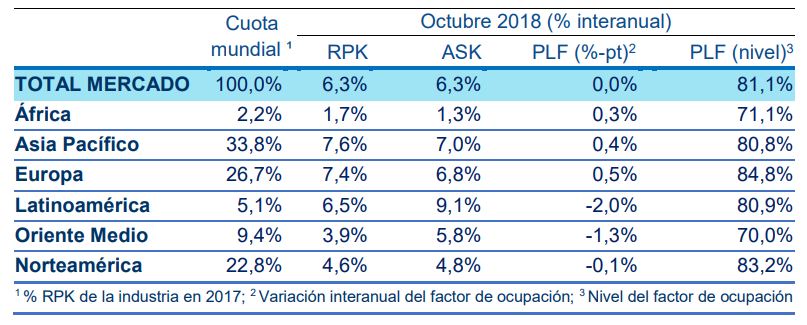 La Asociación de Transporte Aéreo Internacional (IATA) ha publicado los resultados del tráfico mundial de pasajeros de octubre de 2018. La demanda de pasajeros aéreos (medida en pasajeros por kilómetro transportados, RPK por sus siglas en inglés) registró un importante aumento (6,3% interanual) frente al mínimo de ocho meses (5,5% interanual) registrado en septiembre. La capacidad se expandió un 6,3%, mientras que el factor de ocupación se mantuvo estable (81,1%) y en el mismo nivel récord para el mes de octubre del ejercicio anterior.