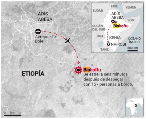 El accidente ocurrió minutos después del despegue del vuelo ET302 del aeropuerto internacional Bole de Adís Adeba a las 08:38 hora Etiopía. El avión, modelo Boeing 737 Max 8, desapareció del radar a las 08:44 am, seis minutos después del despegue, y se estrelló en la región de Bishoftu, a unos 42 kilómetros al sudeste de Adís Abeba.