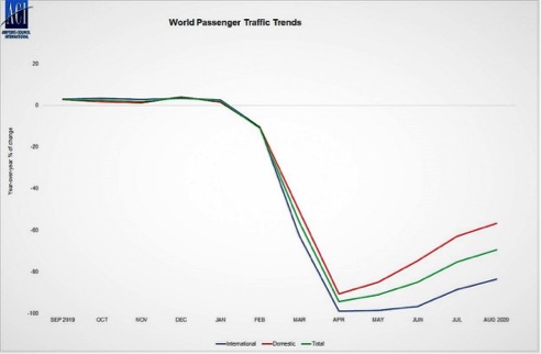 El tráfico mundial de pasajeros disminuyó un -75,1% en julio y un -69,4% en agosto en comparación con los meses correspondientes de 2019. La mejora en los volúmenes de tráfico de pasajeros en comparación con la profunda crisis en la primavera se vio impulsada principalmente por la incipiente recuperación en algunos flujos domésticos, pero la incertidumbre aumenta de cara al resto del año y primer trimestre de 2021 ante las nuevas y aún más duras restricciones para intentar contener la segunda ola de coronavirus en Europa con récords de contagios.