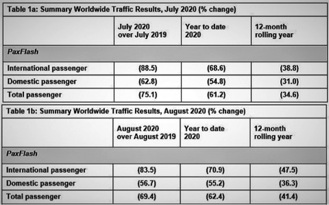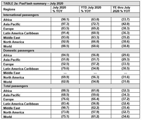 Norteamérica (-70,8%), Latinoamérica-Caribe (-79,6%) y África (-82,5%) continúan registrando caídas significativas en agosto, mejorando sin embargo en más de 10 puntos porcentuales en comparación con junio de 2020. El tráfico internacional de pasajeros sigue prácticamente estancado en la mayoría de las regiones. Aparte de Europa, todas las demás regiones registraron caídas entre -86,6% (África) y -97,1% (Asia-Pacífico) en agosto en comparación con el mismo mes de 2019. El descenso del segmento de pasajeros internacionales fue registró un -70,9% durante los primeros ocho meses de 2020 en comparación con el mismo período en 2019.