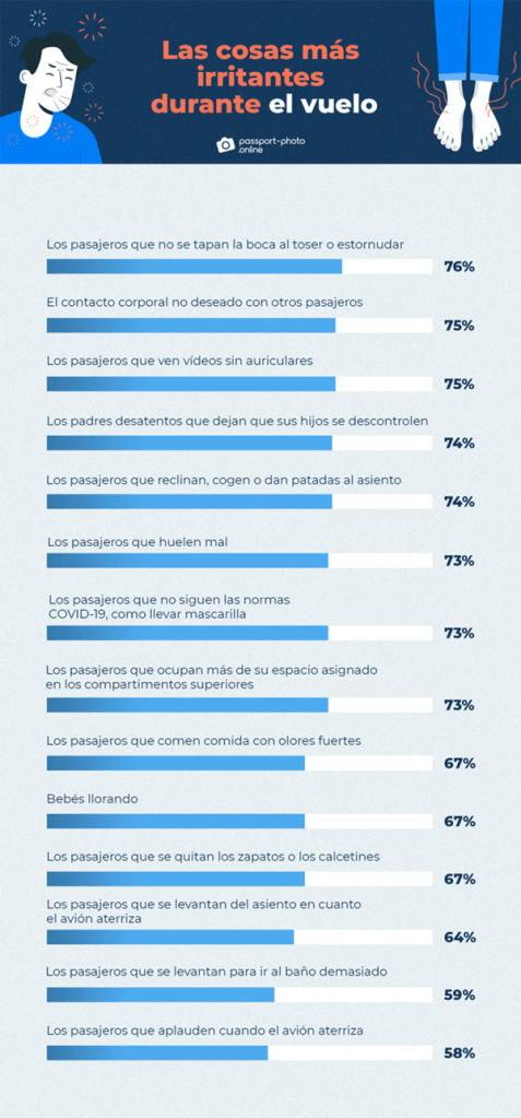 Los pasajeros que no se tapan la boca al toser o estornudar (76%) se llevan la palma entre los comportamientos que provocan más irritación. Le siguen el contacto corporal no deseado con otros pasajeros (75%), los pasajeros que ven vídeos sin auriculares (75%), y los padres desatentos que dejan que sus hijos se descontrolen (74%).