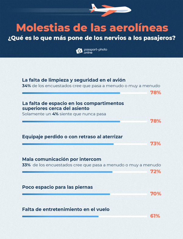 Desde pasajeros que no llevan correctamente la mascarilla hasta retrasos o cancelaciones de vuelos, las oportunidades para irritarse y ponerse nerviosos al tomar un vuelo son innumerables, incluso para los viajeros más calmados. Passport Photo Online ha realizado una encuesta a más de 1.000 personas para ver qué es lo que más les molesta cuando vuelan.